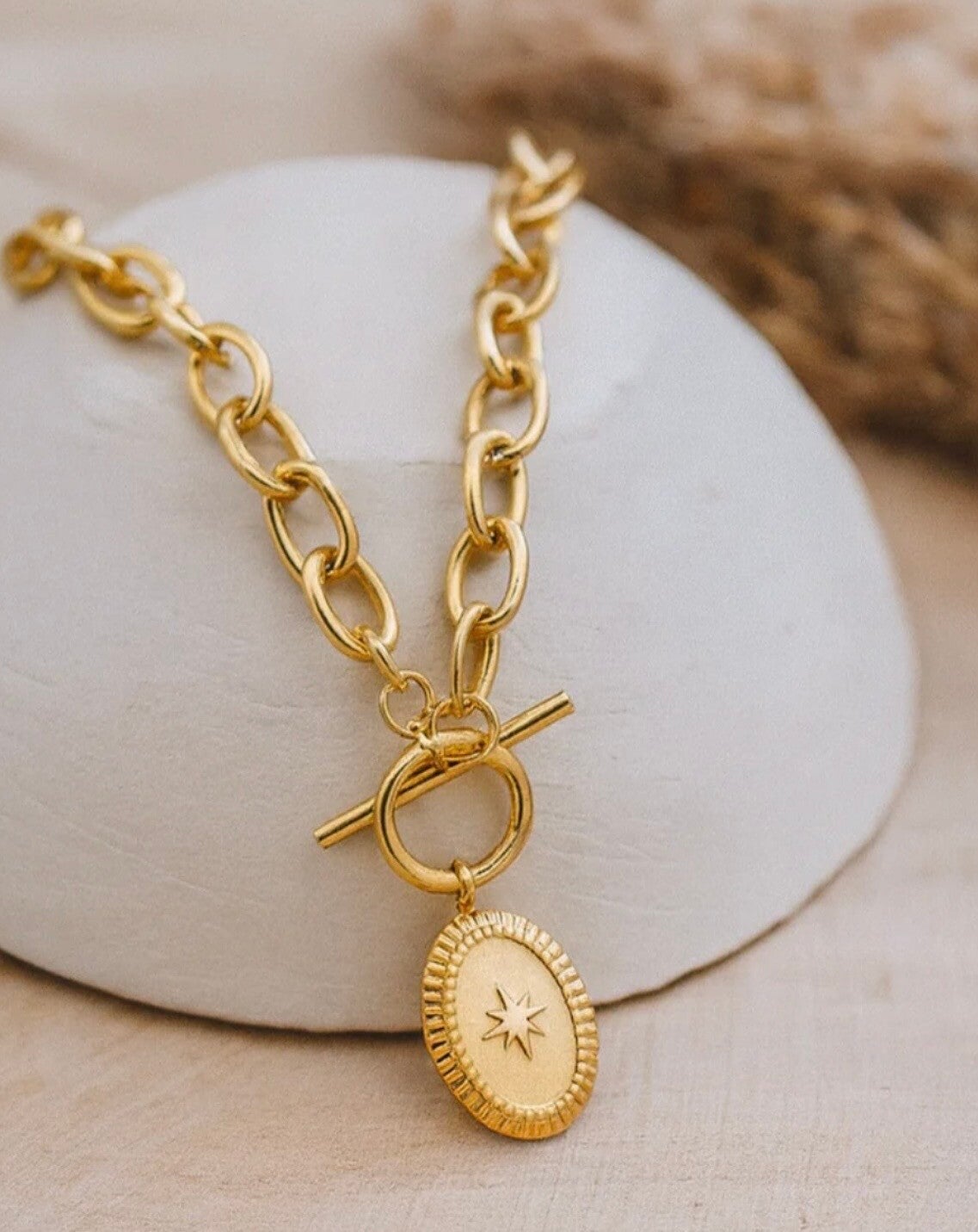 Bold meets celestial. This necklace features a chunky gold-plated stainless steel chain finished with a toggle clasp and a vintage-inspired oval pendant. The engraved starburst at its center gives off timeless energy with a touch of cosmic charm.